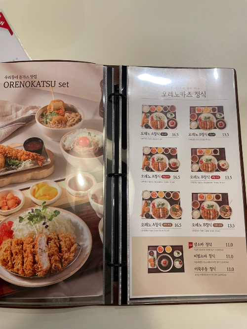 일단 네이버에 검색을 해보시면 메뉴가 자세히 나오는데, 따로 메뉴판도 찍어봤어요! 메뉴판 비주얼이 장난이 아닙니다. 오레노정식A세트 16,500원 B세트 13,500원인데요. A세트에는 에비카츠+고로케가 들어있어서 3천 원 더 비싸요! 저는 B세트만으로도 양이 많을 거 같아서 오레노정식B(냉소바)를 주문했습니다.