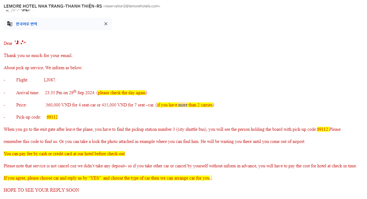 마지막에 If you agree, please choose car and reply us by “YES”  and choose the type of car then we can arrange car for you.라고 적혀있는데 구글 자동해석을 눌러보면 동의하시면 차량을 선택하시고 "예"라고 답변해 주시고 차량 유형을 선택해 주시면 차량을 준비해 드리겠습니다.라고 해석해 줍니다.