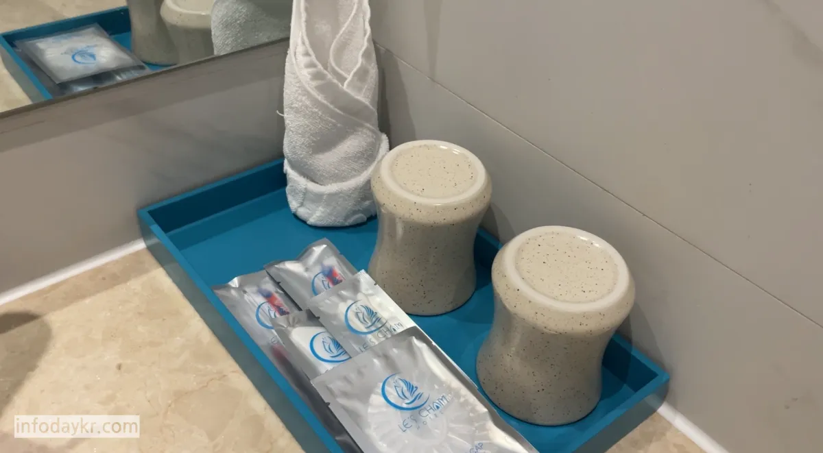 그리고 무엇보다 좋았던 건, 샤워기 필터 / 세면대 필터가 있었습니다. 처음엔 한국인 손님이 놓고간건가 했는데 호텔 측에서 해놓은 것 같더라고요. 레스참 호텔 가시는 분들은 필터 안 꺼내셔도 될 것 같습니다.