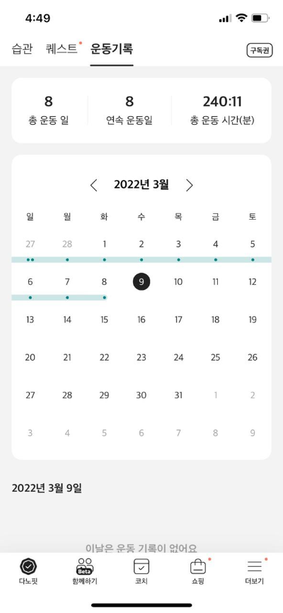 그리고 운동뿐만 아니라, 다노의 목표인 습관 성형에 맞게 식단 기록, 만보 걷기, 2L 물 마시기, 스트레칭 등 스스로 체크할 수 있는 항목들도 제공해주고 있어요. 운동 제외한 모든 항목들은 무료로 이용할 수 있으니 물 마시기, 걷기 목표를 세우신 분들은 다노 앱 이용하시는 것도 좋을 것 같아요! 그리고 이 것들을 하면 포인트를 모을 수 있는데, 나중에 다노 샵에서 제품 구매할 때 사용할 수 있답니다. 저는 벌써 8,000포인트를 모았네요!