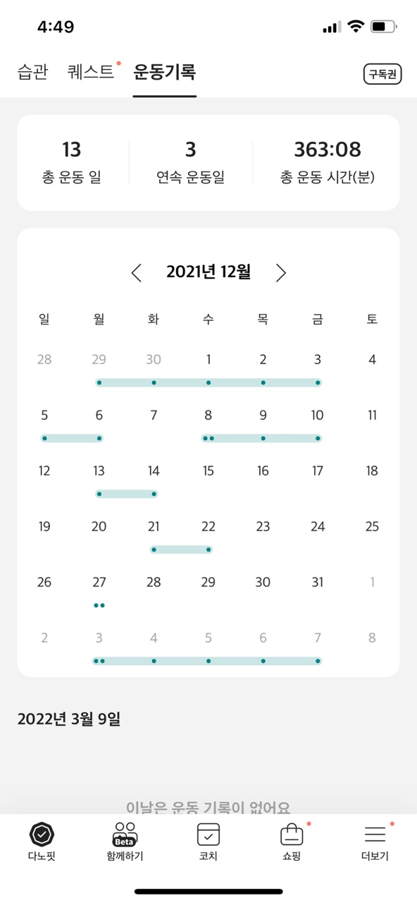 일단 진으로 제가 작년 11월부터 이용한 기록이에요! 기록을 보시면 정말 하기 싫어서 대충 한 달도 있고, 이번 달(3월)은 하루도 빠짐없이 해보려고 노력 중이에요! 할 수 있겠죠? 곧 봄이고 여름이니까 파이팅해 보겠습니다.