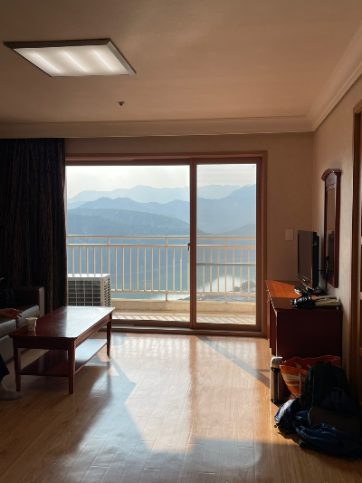 위 사진은 숙소에서 찍은 전경입니다. 레이크뷰 전경이 너무 멋있지 않나요? 속이 뻥 뚫리는 뷰였습니다! 또한 아래 사진은 객실에 들어서자마자 보이는 전경입니다. 레이크뷰 선택하길 너무 잘한 것 같죠?! 또한 소노문 단양은 이스트/웨스트 두 개의 동으로 나뉘는데요. 저는 이스트 동이였고, 묵었던 객실은 12층 3206호였습니다.