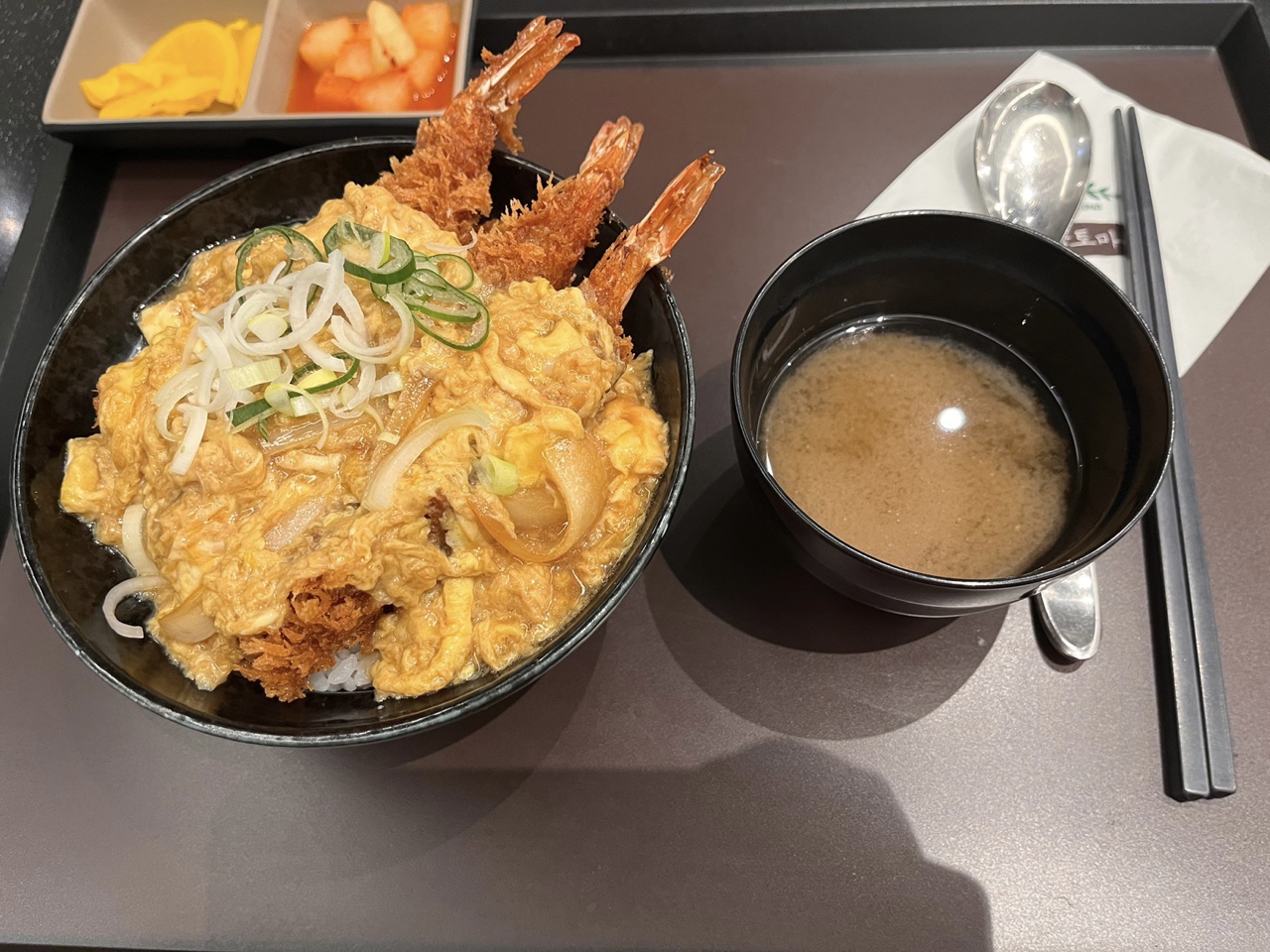 친구가 시킨 새우덮밥입니다. 새우가 3개나 들어있는데 새우가 통통하고 진짜 컸어요! 사진에서도 느껴지지 않나요?! 새우덮밥은 사실 너무 예상 가능한 맛이었지만, 그럼에도 맛있었어요! 여러분도 식품관에서 식사하시게 되면 친구분들과 여러 가지 메뉴를 시켜서 드셔 보시길 추천합니다. 정말 먹고 싶은 게 많아서 못 고르시게 될 거예요ㅎㅎ