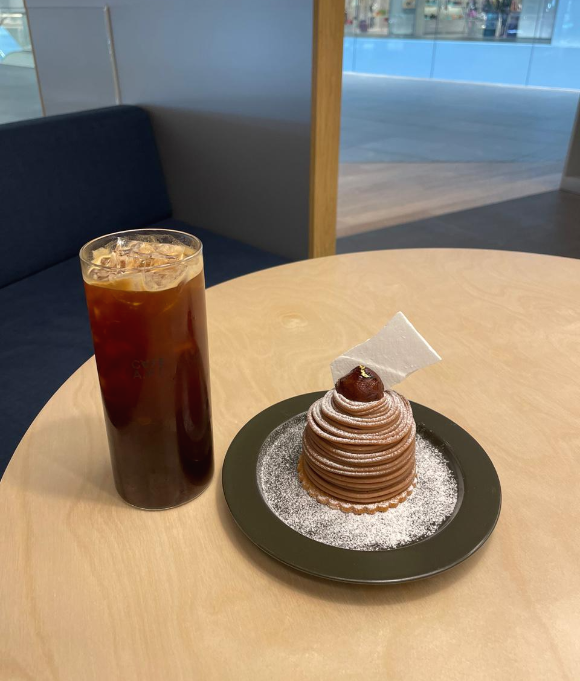 사실 따뜻한 음료 시키면 A.P.C 로고를 새겨주시는 게 너무 예뻐 보였지만, 목이 너무 말랐어서 과감히 패스하고 아메리카노를 시켰어요. 아아는 역시 진리죠! 그리고 디저트는 몽블랑을 시켰는데, 너무 맛있었어요! 먹는 내내 친구랑 고급 디저트 느낌이 난다며 맛있다고 하면서 먹었습니다. 운 좋게 사람이 많지 않았어서 좋았어요!
