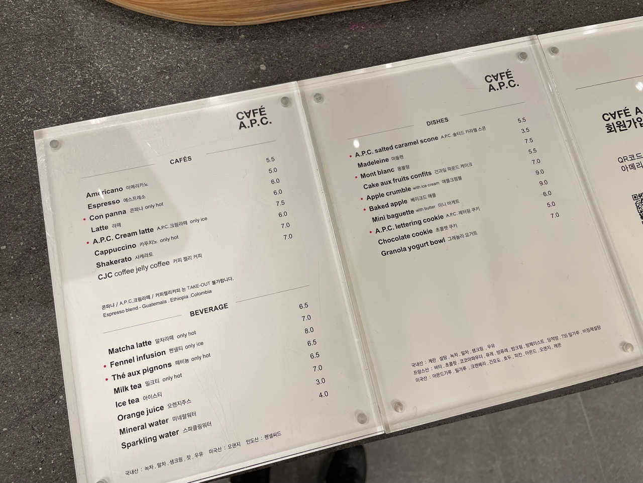 카페 아페쎄(A.P.C) 아이스 아메리카노(5,500원), 몽블랑(7,500원)