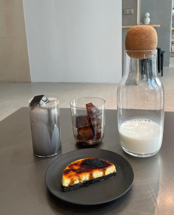 맨 왼쪽부터, 더치블랙입니다. 블랙 콘셉트답게 커피 종류도 블랙이더라고요. 음료 블랙은 비주얼도 괜찮은 것 같아요! 맛은 흑임자 시럽을 섞어 만든 거라 그런지 흑임자 라떼 맛이었습니다. 그리고 오른쪽에 큰 우유병에 나온 게 피에타 라떼입니다. 더치커피 얼음에 우유를 부어마시는 라떼라고 해서 시켰는데, 우유병이 너무 커서 당황했어요. 콘셉트이겠지만 이건 좀 이해가 안되는(ㅋㅋ) 나왔을 때 너무 웃겼어요. 디저트는 유명 시그니처 피크케이크를 시켜보려고 했지만, 스몰 사이즈도 가격이 꽤 나가더라고요! 그래서 저희는 누 브릴뤠 크림브륄레를 시켰는데, 역시 크림브륄레는 배신이 없죠! 너무 맛있었습니다.