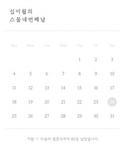 두 번째, 예식일 달력 표기와 D-day 표시까지 있다는 점! 제 친구가 이 부분 보고 이런 것도 나오냐고 신기해했습니다!