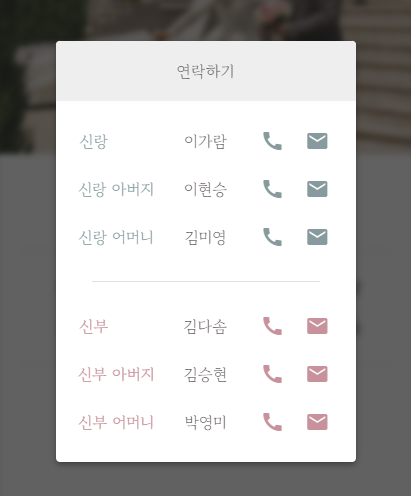 첫 번째, 연락하기를 누르면 신부 측/신랑 측 구분 되게 나오는 게 좋더라고요. 이렇게 안되어있는 곳이 꽤 있었어요.