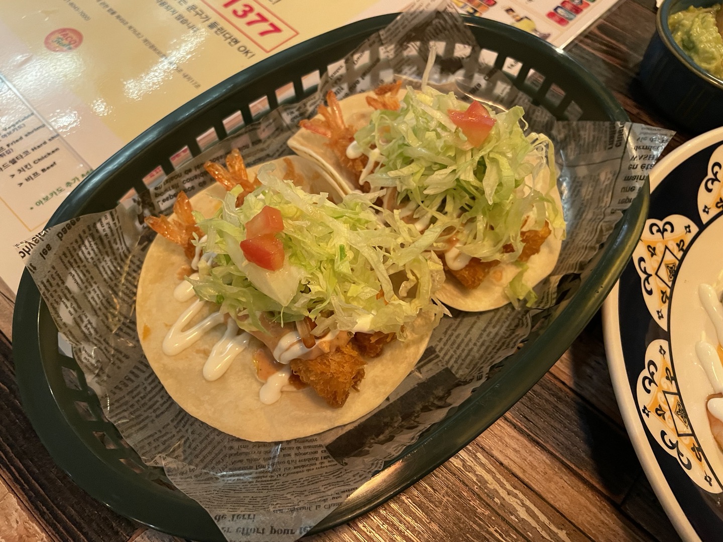 03. 타코 - 쉬림프(새우튀김) 8,500원 사실 여러 번 방문했고 타코 전문점인데.. 타코 시킨 것 처음이었어요! 타코 하나 당 큰 새우가 두 개씩이나 들어가 있어서 맛있었어요. 그렇지만 저는 타코보다는 다른 메뉴를 하나 더 시키시는 걸 추천드릴게요!