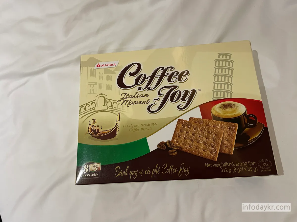 사실 커피조이는 우리나라 옛날과자인 빠닷코코넛과 비슷할 것 같아서 큰 기대가 없었습니다. 그런데 웬걸! 한 입 먹자마자 그 자리에서 한 봉지를 순삭 했습니다. 크래커가 두꺼울 거라는 예상과 다른 게 진짜 얇고 바삭바삭하니 커피맛이 나면서 달더라고요!! 진짜 너무 맛있었어요.