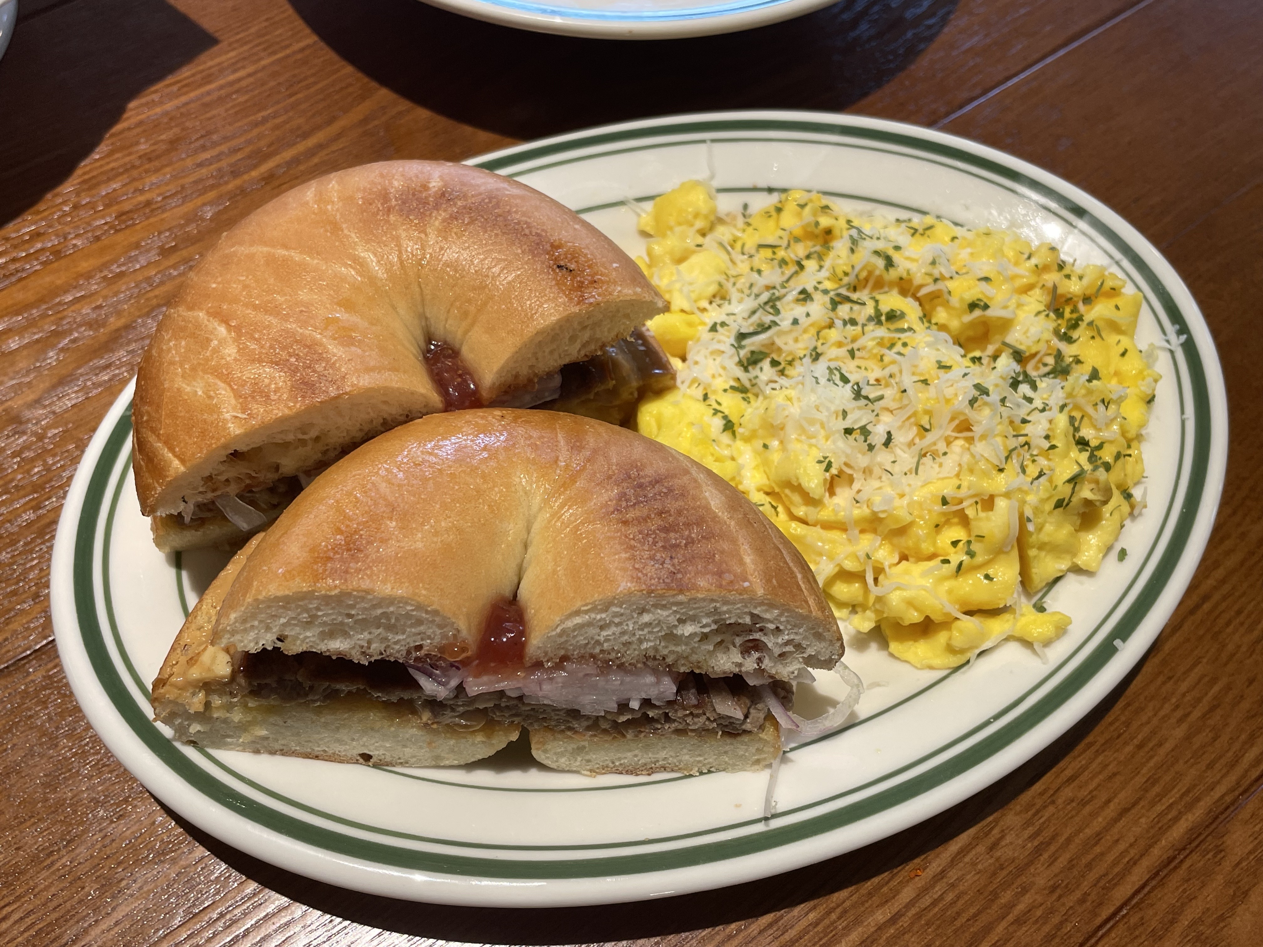 햄 앤 치즈 베이글 샌드위치와 스크램블 에그