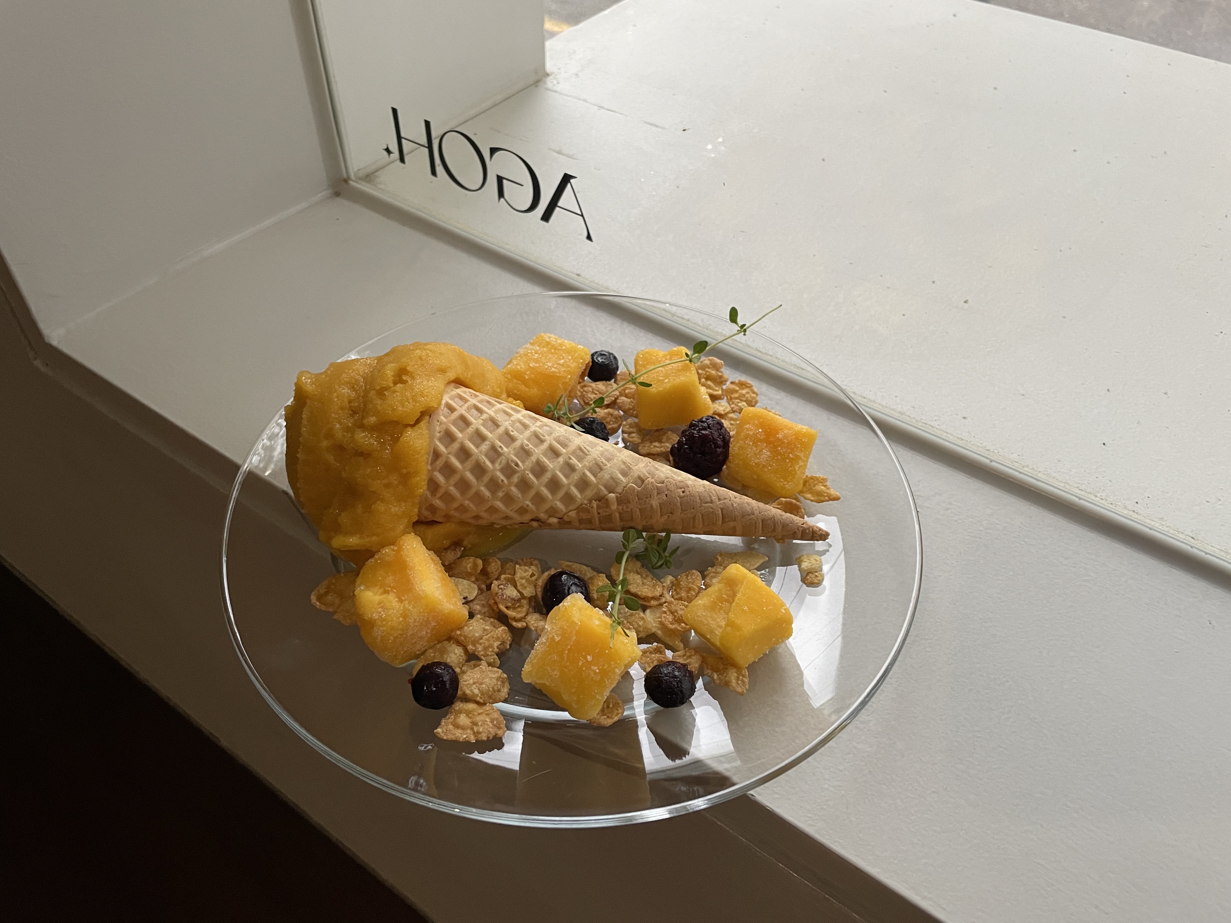 아까 보여드렸던 큰 창틀에 두고 찍은 사진이에요. 너무 예쁘게 나오더라고요! 일단 소르베 비주얼은 합격이에요! 그렇지만 맛은 기대보다는 쏘쏘 했던 것 같아요. 개인적인 생각일 뿐이니, 직접 드셔 보시길 추천드려요. 제 남자친구는 맛있다고 다 먹었답니다! 그리고 콘 안에는 시리얼이랑 코코넛젤리가 들어있어요. 아이스크림이랑 다 같이 한 입에 먹어야 맛있습니다.