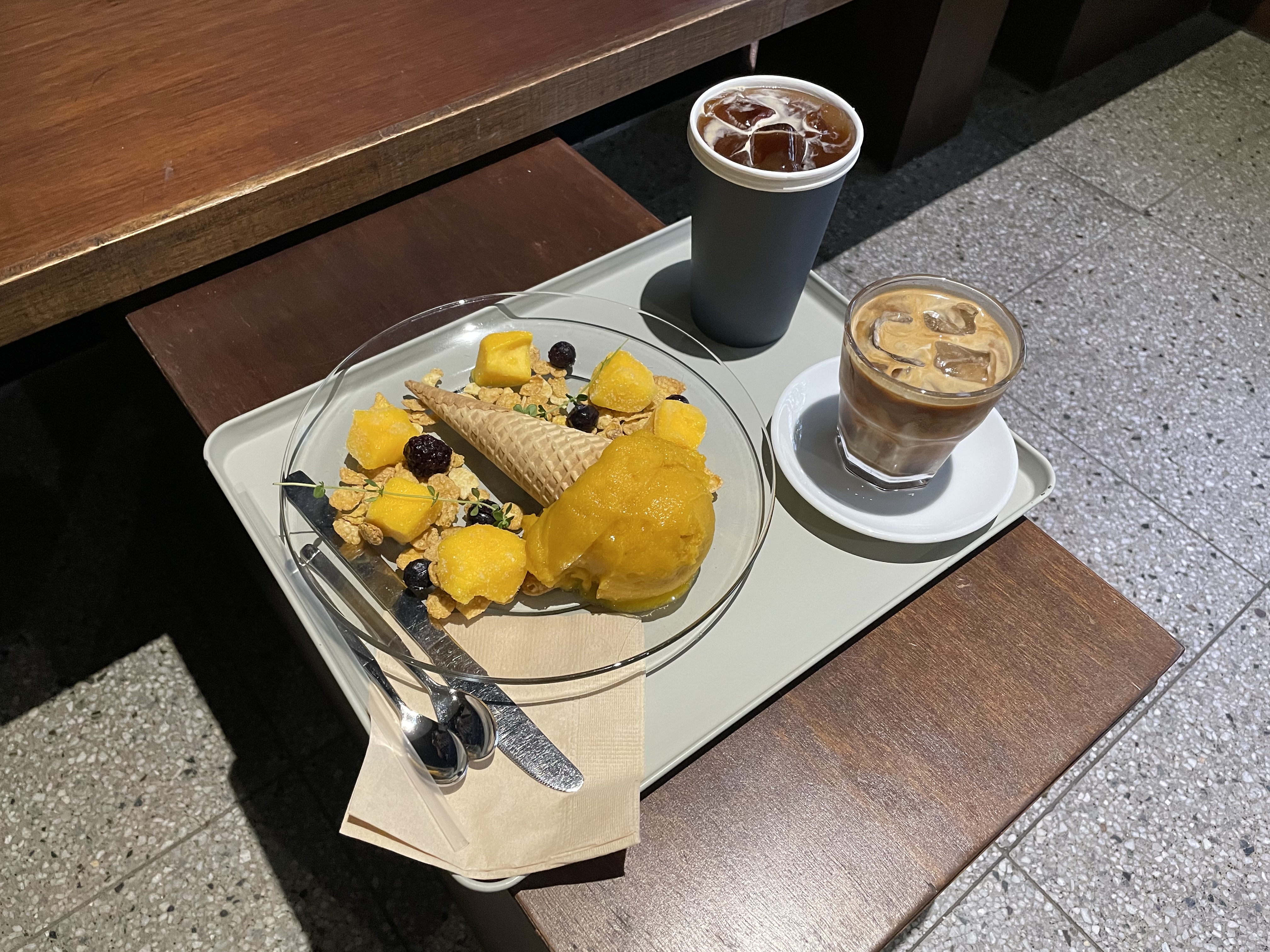 그래서 주문한 커피 2잔과, 망고 소르베입니다. 아이스크림은 사진 열심히 찍다가 살짝 녹은 모습이에요.