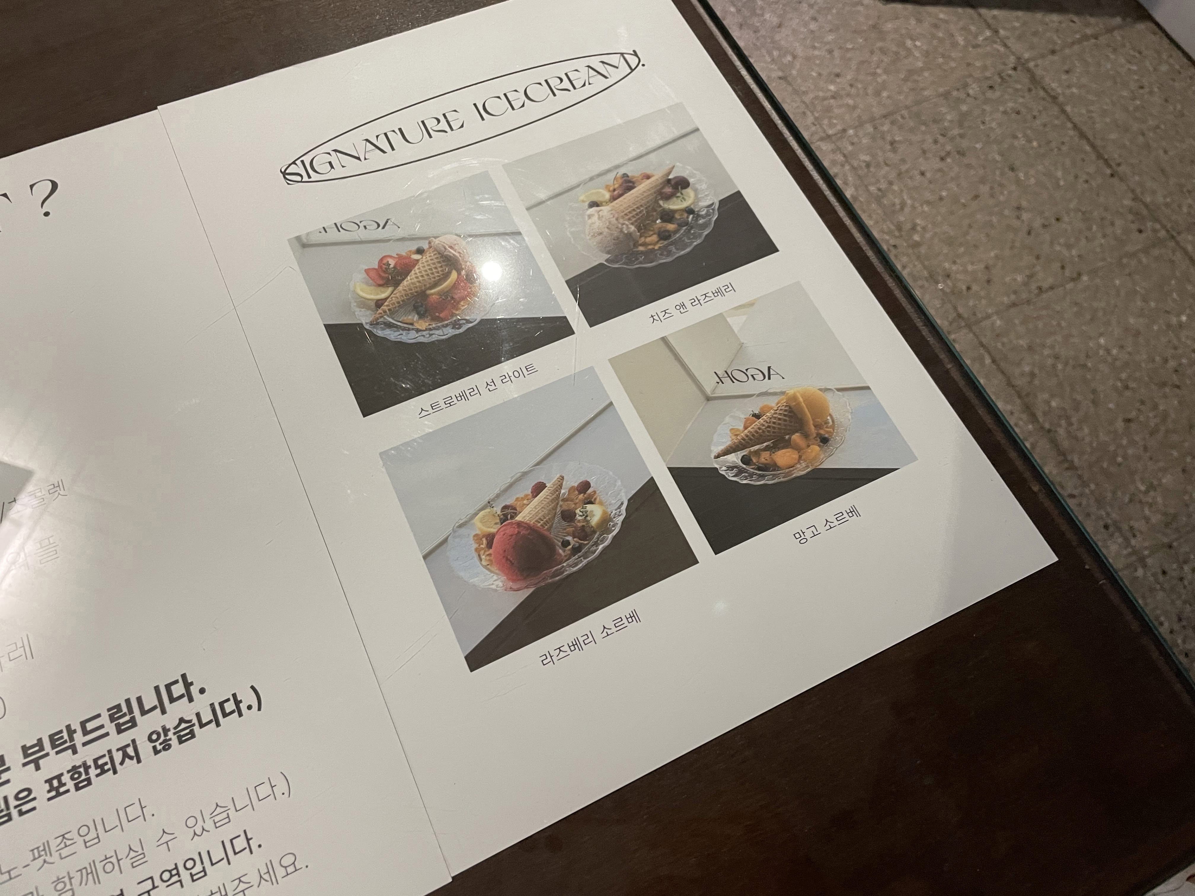 이곳의 대표 메뉴 시그니처 아이스크림 소르베입니다. 다만 아쉬웠던 점은 1인 1음료를 시켜야 하는데, 디저트 메뉴는 음료에 포함이 안된다는 거예요. 사실 아이스크림 메뉴가 저렴한 가격도 아닌데 1인 1메뉴에 포함이 안된다는 게 너무한 것이 아닌가 라는 생각이 들었습니다. 사실 저희가 이 날 다른 카페에 갔다가 두 번째 방문한 카페였어서 더 당황스러웠던 것 같아요.