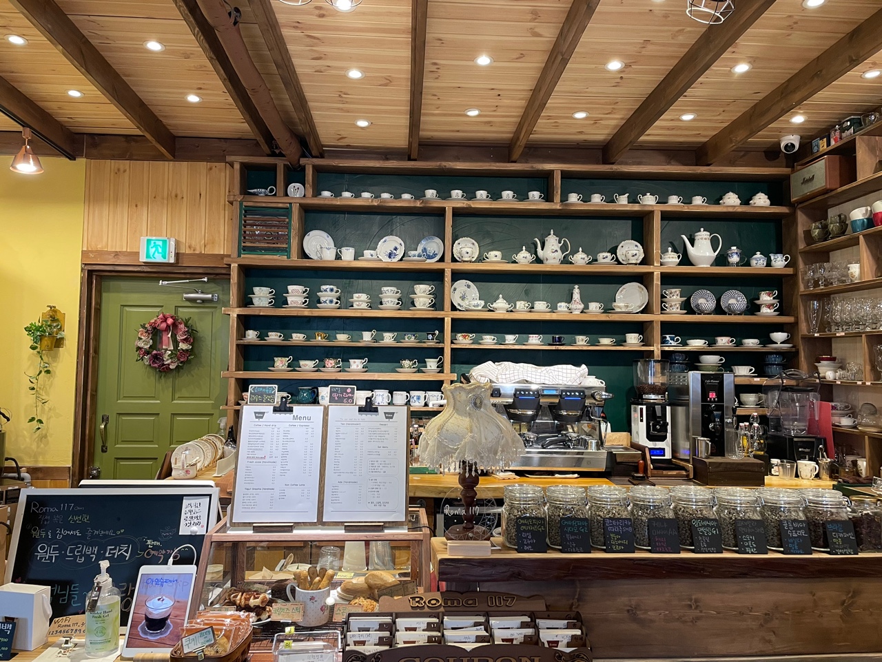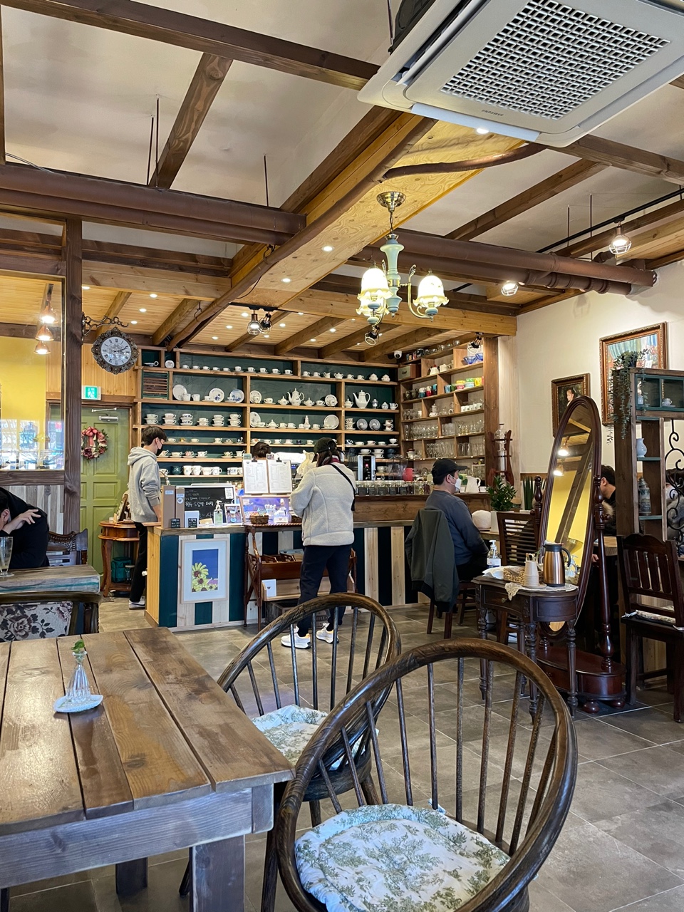 문 열고 안으로 들어가는 순간, 앤티크 한 느낌에 아기자기한 찻잔과 그릇들이 가득해서 한눈에 반했어요! 테이블이 많지는 않았지만 손님들도 많았고요, 공간이 주는 포근한 느낌이 너무 좋았답니다. 사진은 카운터 모습인데요 뒤에 찻잔들 보이지요?! 찻잔 모으는 게 취미이신지 예쁜 것들이 많더라고요.
