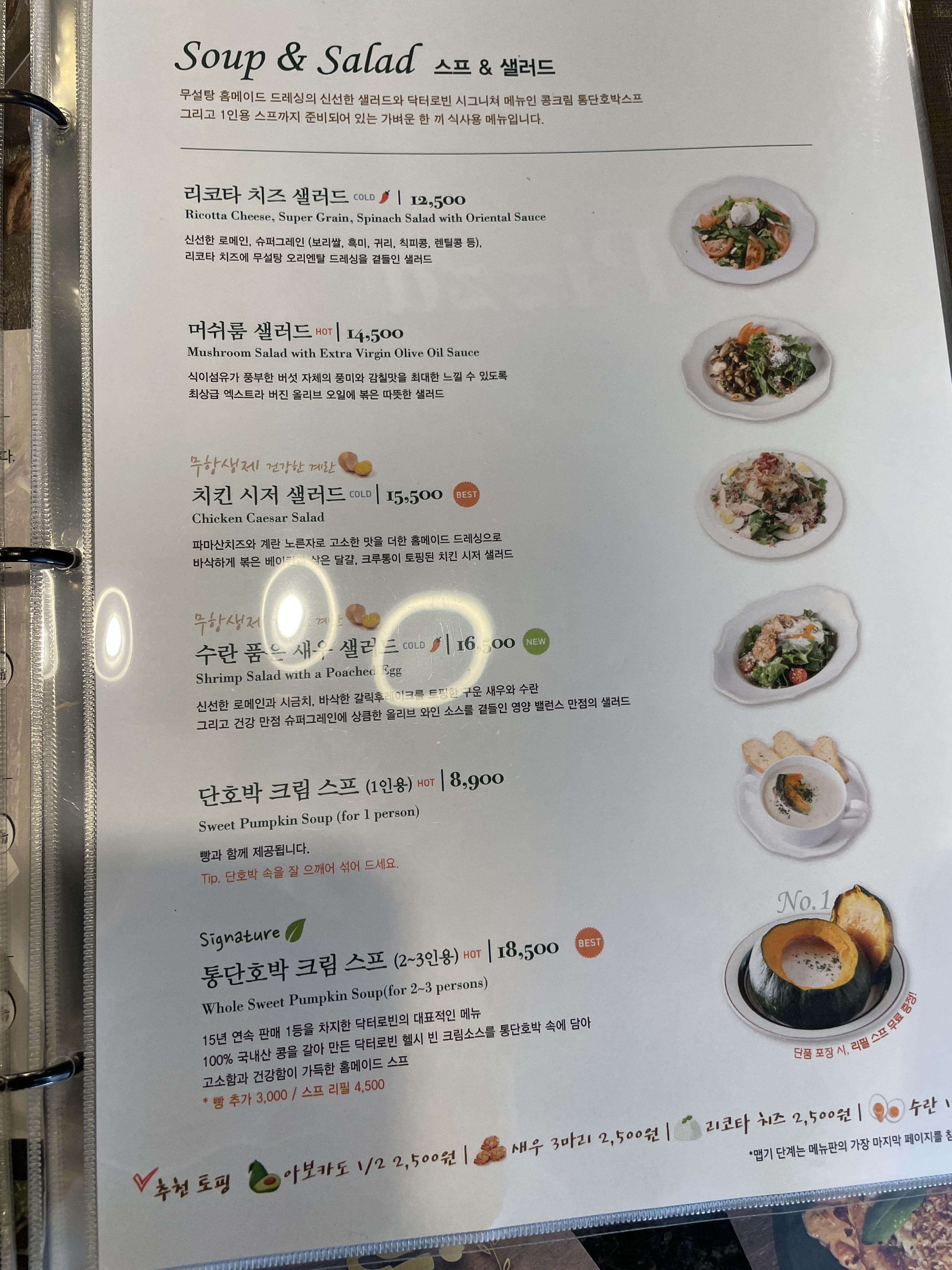 입구에 있던 메뉴도 찍어보았고요! 단호박 수프가 제일 메인에 있네요. 15년째 시그니처 메뉴라고 적혀있었어요!