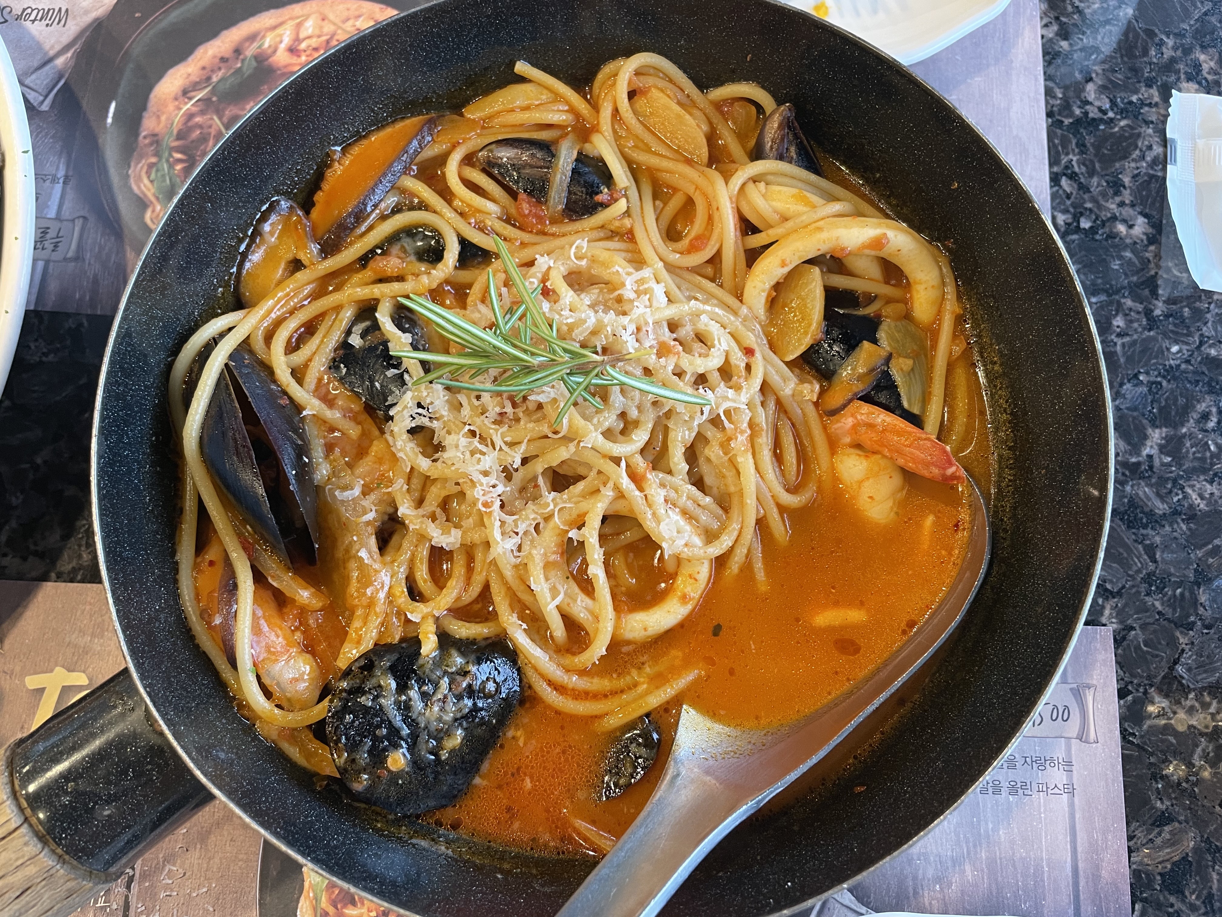 해산물 국물 파스타(18,500원) 토마토소스를 베이스로 매콤하게 끓여낸 국물 파스타