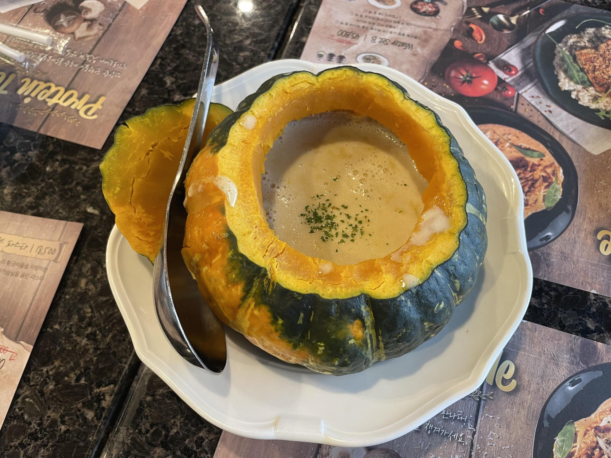 통단호박 크림수프(18,500원)2~3인 용이라고 적혀있었구요, 15년째 시그니처 메뉴라고 하니 안시켜 볼 수 없었어요! 앞서 말씀 드렸듯이 크림수프는 우유 대신 100% 콩을 갈아서 만든 거라고 해요! 기대하는 마음으로 한 입 먹었는데, 진짜 고소하고 맛있었어요! 그리고 단호박이 통째로 나오니까, 단호박을 긁어서 먹으라고 안내해주셔서 단호박 긁어서 스프랑 같이 먹으니까 진짜 맛있더라고요 엄지 척!!!!!!! 영등포 신세계백화점 맛집 인정!! 1인용 크림수프도 있는데 호박째로 나오진  않아서 2~3인용 시켜서 드시길 추천드립니다.