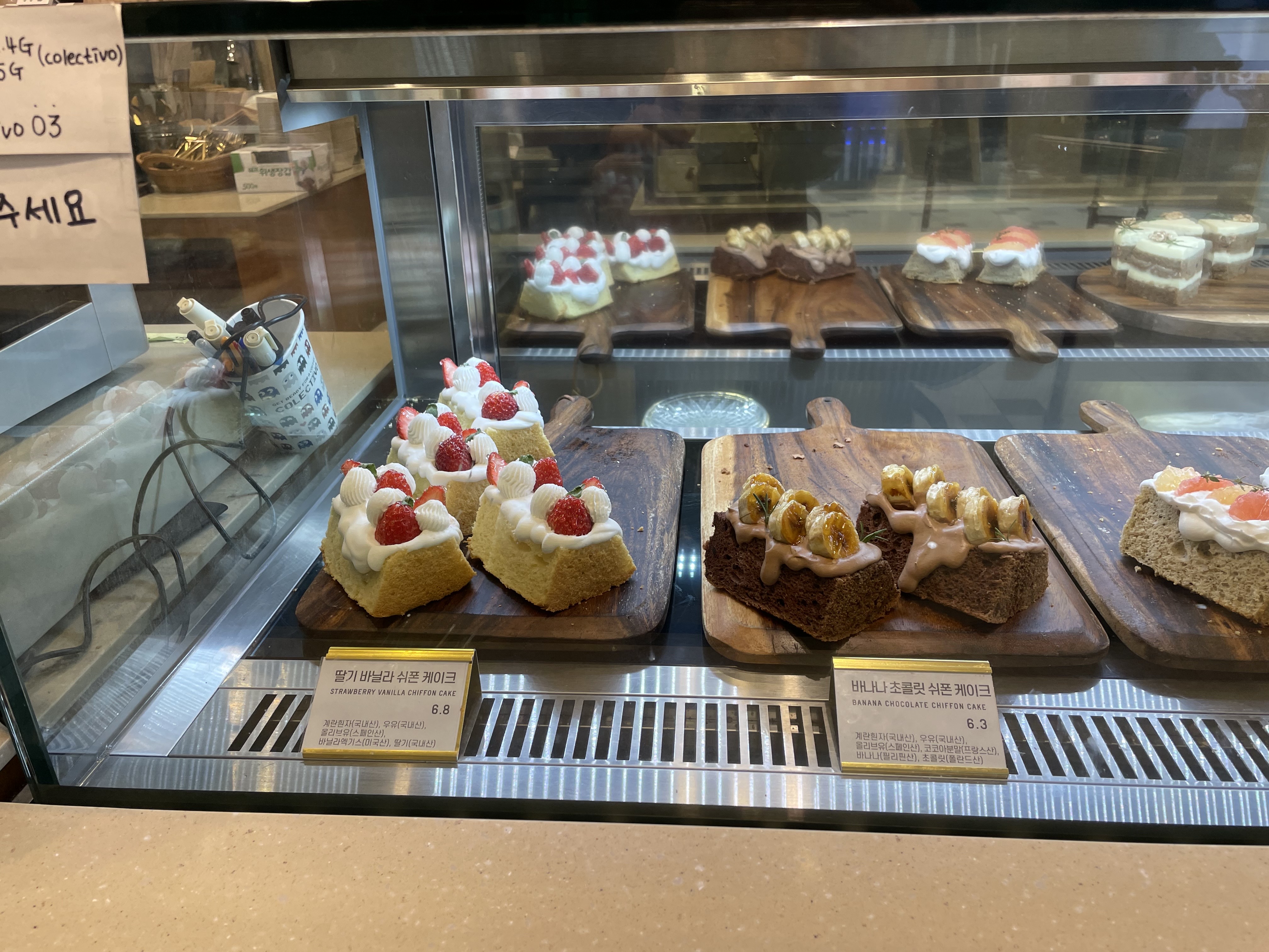 그리고 계산대 옆에 있던 게 저는 일반 케이크인 줄 알았는데, 시폰 케이크였어요. 쉬폰케이크 종류가 상당히 많았어요! 저는 이 날 시폰 케이크는 당기지 않아서 패스했지만, 비주얼이 참 예뻤습니다.