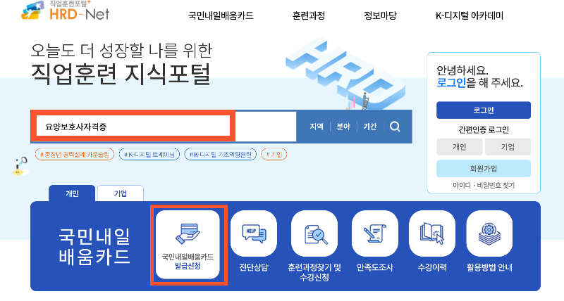 - HRD-NET 사이트 회원가입 후 내일 배움 카드 신청