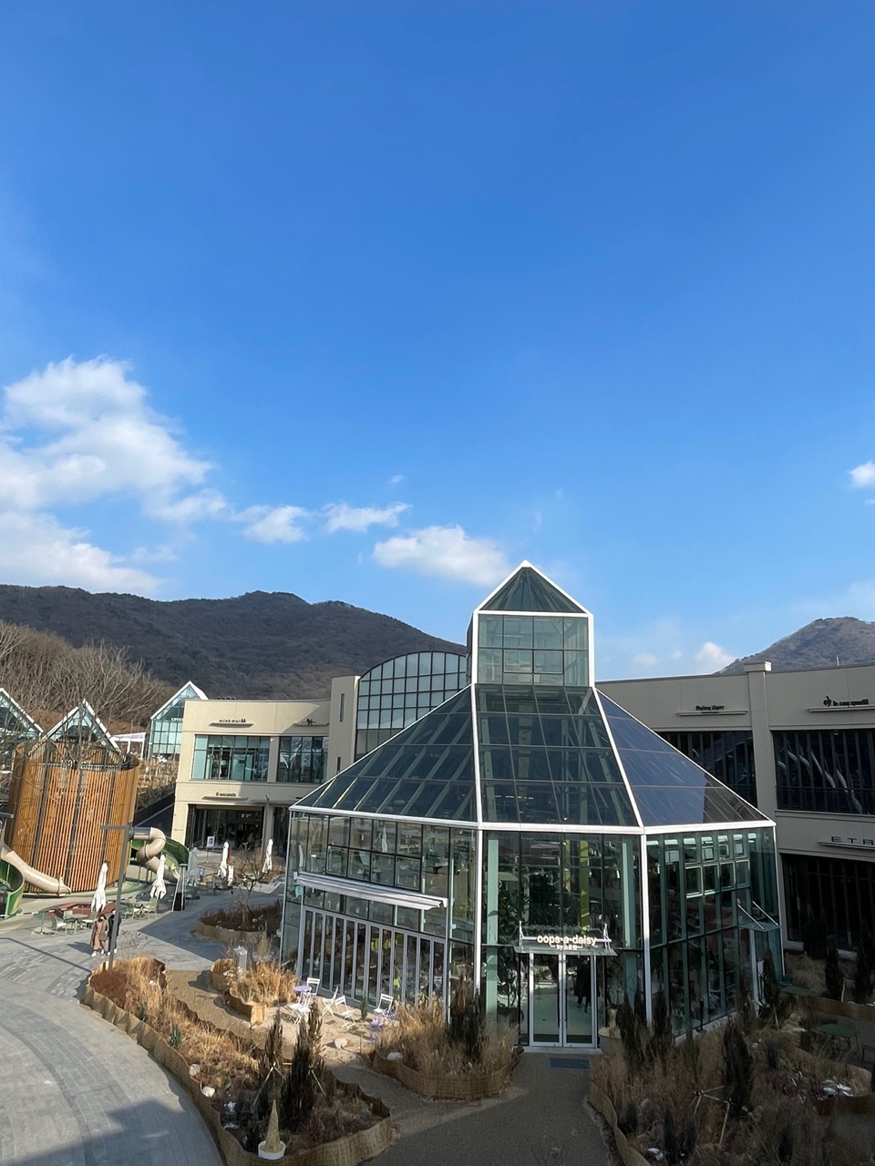여기는 잔디광장 바로 옆에 있는, 온실 느낌의 웁스어데이지라는 카페예요! 온실 콘셉트로 안에 들여다보니 꽃이랑 식물들이 가득하더라고요!