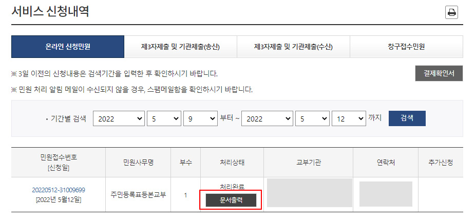 5. 민원 신청하기 버튼을 누르면 위와 같이 서비스 신청내역이 뜹니다. 그러면 이제 정말 정말 마지막으로 '문서 출력' 버튼을 클릭합니다. 문서출력 버튼을 누르시면 인쇄할 수 있는 화면이 뜹니다.