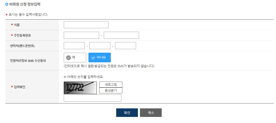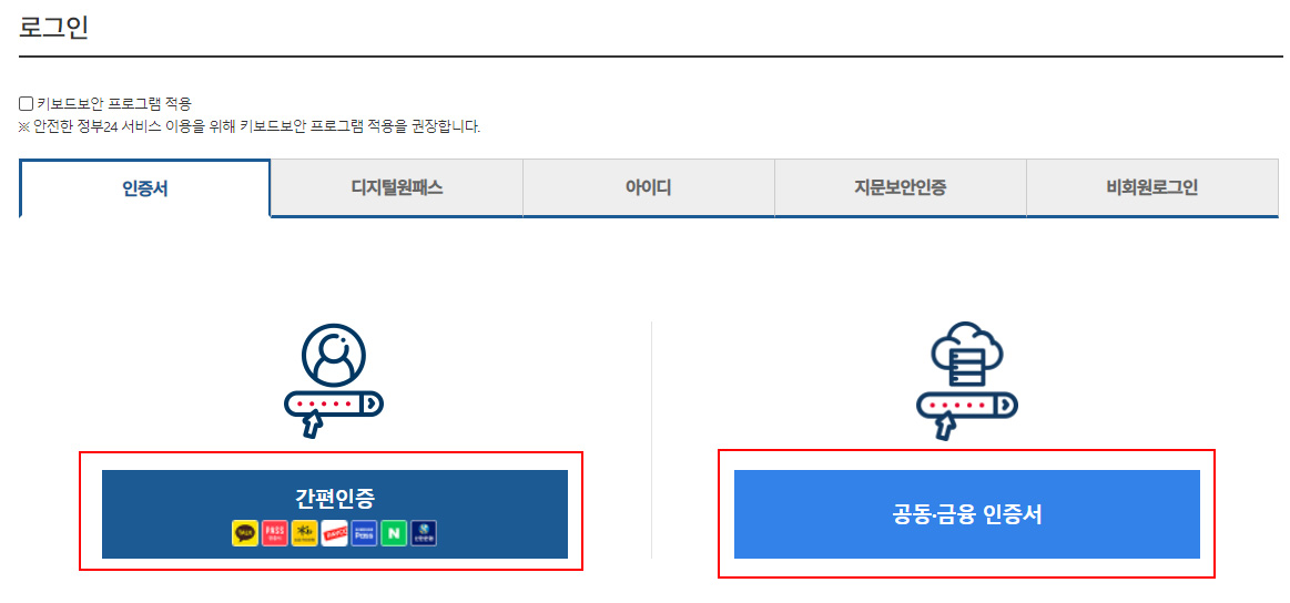 비회원 신청하기는 인증서가 없으신 분들이 하시면 되는데요. 포스팅을 하면서 처음으로 눌러봤는데, 빨간색 표시되어있는 이름/주민등록번호/입력 확인 항목만 입력하면 발급을 받을 수 있더라고요. 인증서보다 훨씬 간편한 것 같아요! 다만 일부 서비스에는 공동 인증서가 필요할 수 있다고 하니, 안전하게 인증서가 있는 게 좋을 거 같습니다.