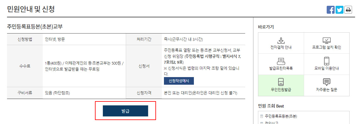 2. 주민등록등본(초본)을 클릭하면 위와 같은 화면이 나옵니다. 여기서 발급 버튼을 클릭해주시면 됩니다. 안내에 나와있듯이 주민센터/동사무소 방문시 수수료 1통에 400원(또는 500원)이지만, 인터넷으로 발급받을 때는 무료라고 나와있어요! 인터넷으로 발급하는 게 역시 좋겠죠..?!