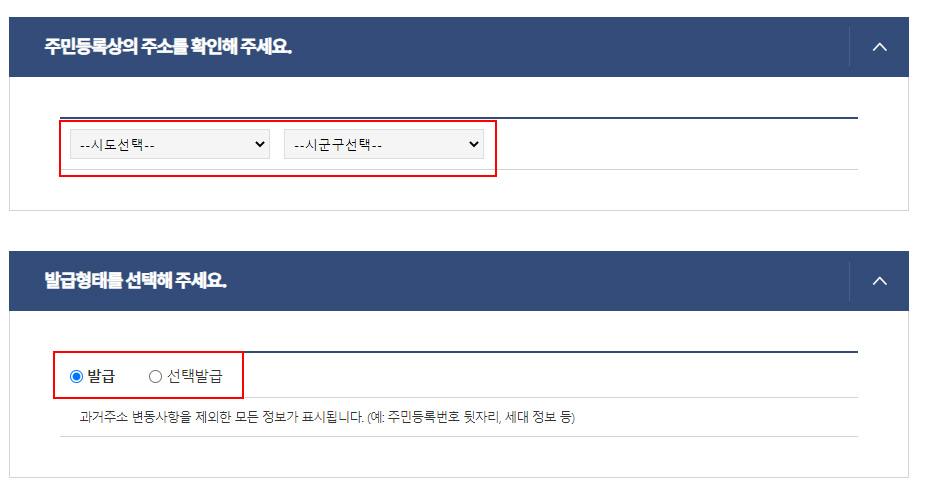 4. 인증을 진행하셨다면, 위와 같은 화면이 뜰 거예요. 인증을 했기 때문에 시/군/구는 자동으로 세팅이 되어있을 거예요. 그리고 발급 형태에는 발급/선택 발급이 있는데요. 일반적으로 많이 이용하는 발급을 선택해주시면 주민등록번호 뒷자리, 세대정보 등 모든 정보가 표시됩니다. 선택 발급을 선택하시면 과거의 주소 변동 사항, 세대 구성 정보, 세대 구성원 정보, 주민등록번호 뒷자리 네 가지 중 원하시는 항목만 선택하실 수 있습니다.