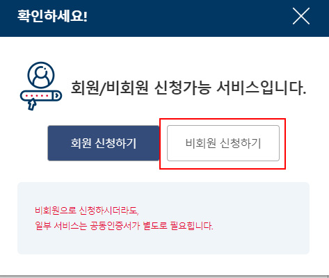 발급 버튼을 누르면 회원/비회원 신청 가능 안내 창이 뜨는데요. 회원 신청하기는 흔히 알고 있는 간편 인증(카카오, 네이버 등)과 공동·금융인증서를 사용한 로그인 방식입니다. 간편 인증과 인증서가 있으신 분들은 회원 신청하기를 눌러서 진행해주시면 됩니다.