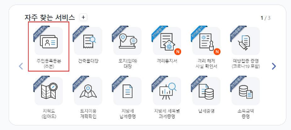 1. 정부24 접속 후 -> 주민등록등본(초본)을 클릭해줍니다. 포털사이트에서 '주민등록등본 인터넷 발급' 또는 '정부24'를 검색하시면 정부24 페이지가 나오는데요. 정부24 페이지 접속 후 메인화면 중간에 자주 찾는 서비스에서 주민등록등본(초본)을 클릭해주시면 됩니다.