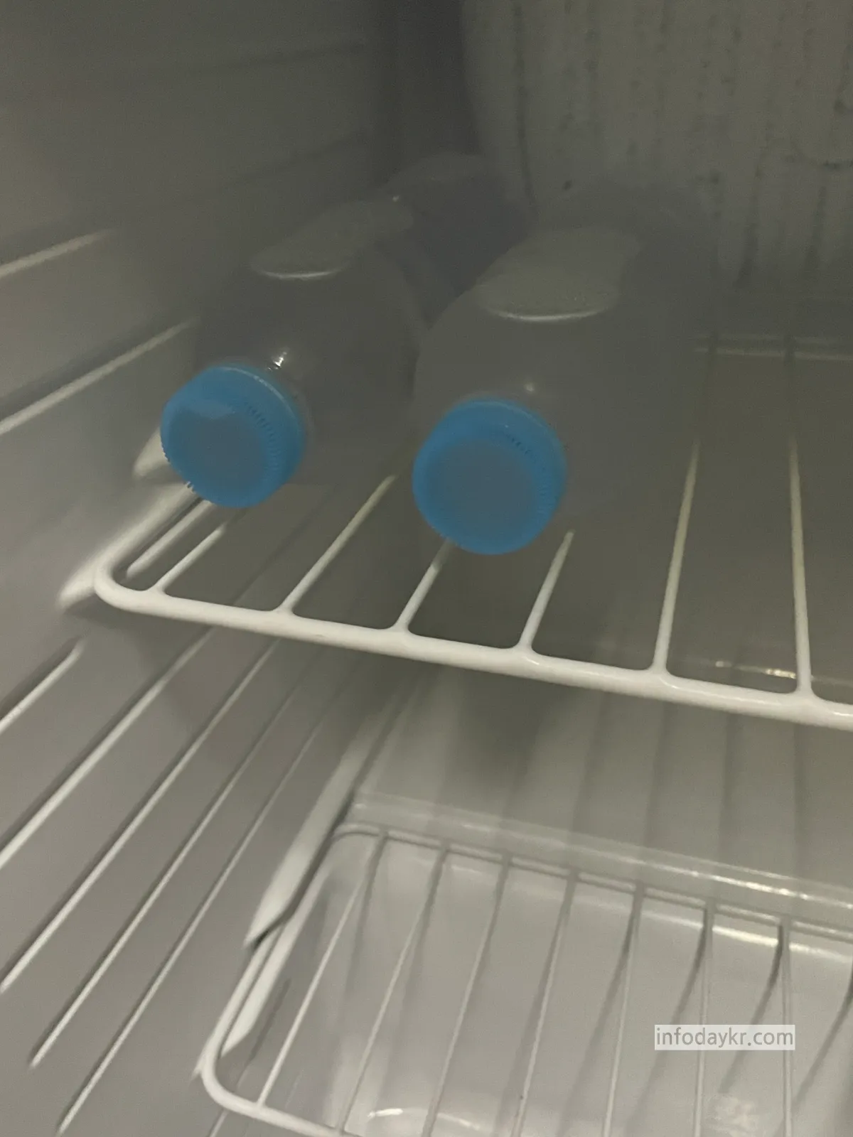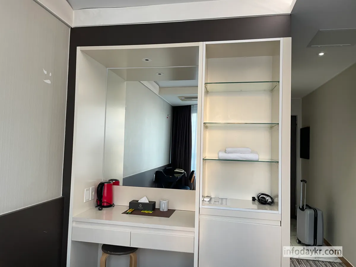 작은 냉장고도 있었고요, 생수 2병이 기본 제공이기 때문에 혼자 묵으시는 분들은 충분 할 거예요! 저는 이것도 모르고 편의점에서 생수를 하나 더 사버렸어요. 꼭 냉장고 미리 살펴보고 편의점 가세요!