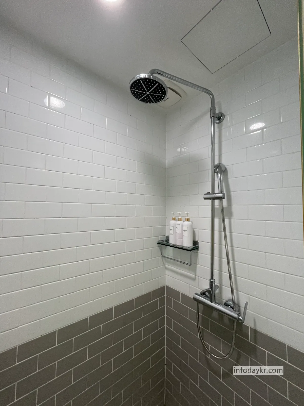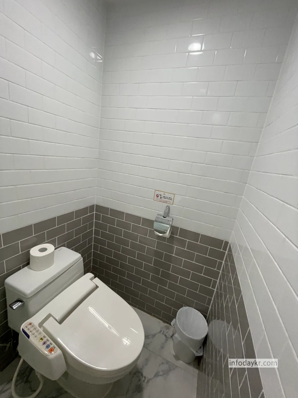 기본적인 생수2개, 수건 2장, 드라이기, 일회용 빗, 비누, 샴푸, 컨디셔너, 바디워시가 있었습니다. 칫솔치약은 제공하지 않으니 챙겨 오시길 바라요! 저는 치약을 깜빡해서 1층 세븐일레븐에서 구입했습니다. 화장실은 샤워실, 화장실은 분리가 되어있었고 가운데 세면대가 있었어요! 화장실도 깔끔했습니다.