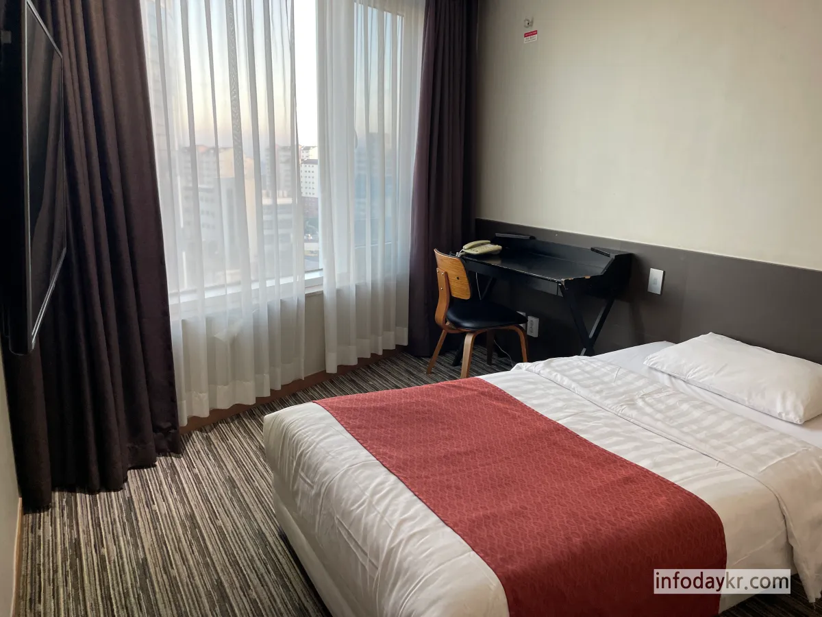 저는 혼자 묵는 거 였기 때문에 싱글룸으로 예약했어요! 가격은 제가 간 날이 평일이기도 했고 약 2만5천원 정도로 예약했습니다. 너무 가성비 좋지 않나요? 아침 일찍 나갈 거어서 조식은 따로 포함하지 않고 예약했습니다. 일단 객실은 혼자 묵기 충분했습니다.