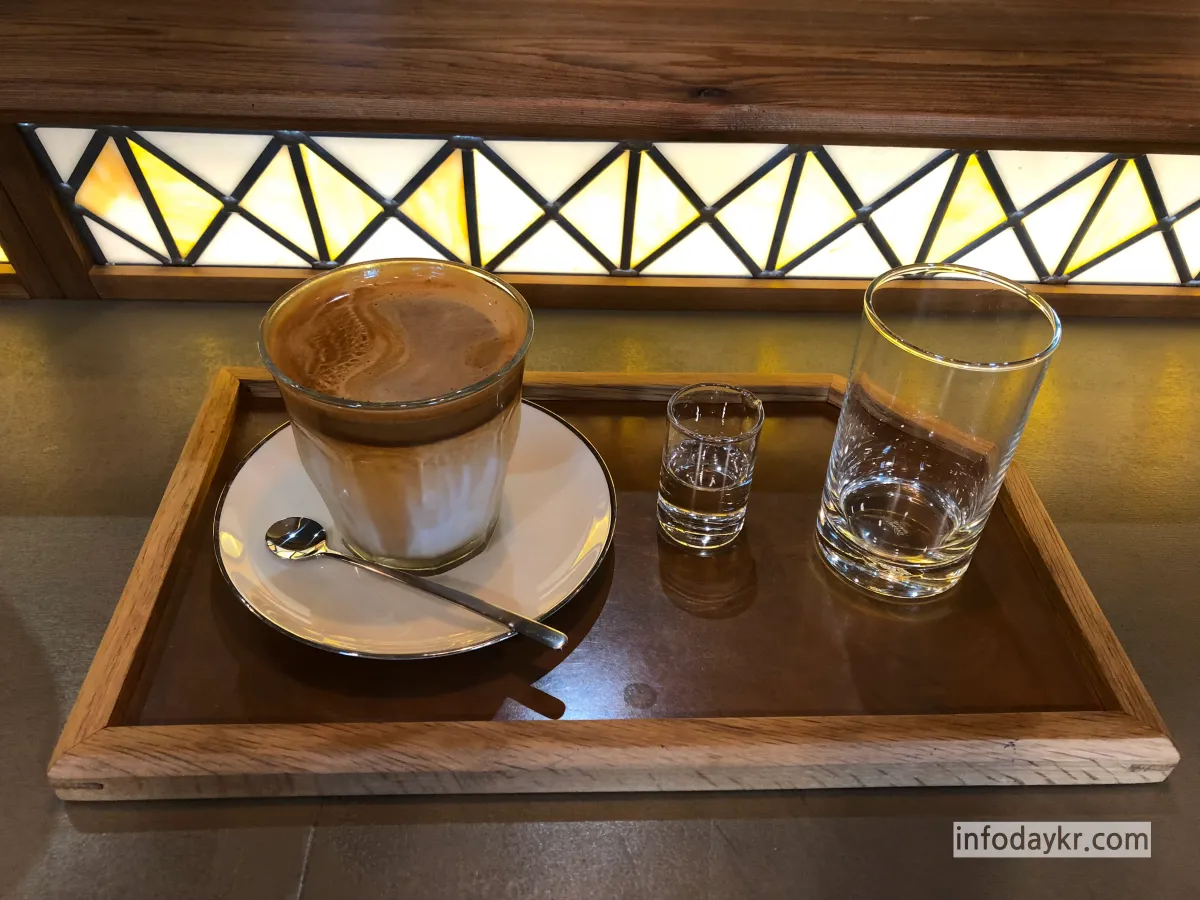 라떼는 기본/아이스/핫 중에 선택할 수 있습니다. 기본은 얼음 없는 차가운 우유에 에스프레소 더블샷을 넣어주십니다. 얼음이 없는 게 처음에는 어색했지만, 얼음이 녹으면 나중에 밍밍해지기 때문에 기본 라떼가 이곳의 시그니처이니 꼭 한 번 드셔보시길 추천드립니다.