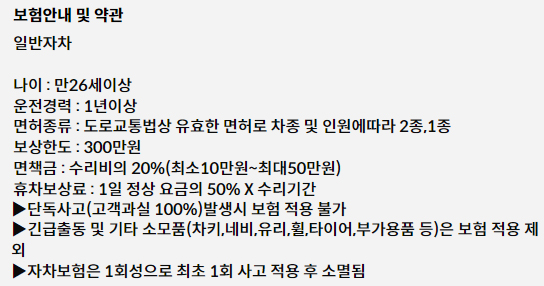 기타 긴급출동 및 기타 소모품(차키,네비,유리,부가용품 등)은 보험 적용 제외 긴급출동 및 기타 소모품(차키,네비,유리,휠,타이어,부가용품 등)은 보험 적용 제외