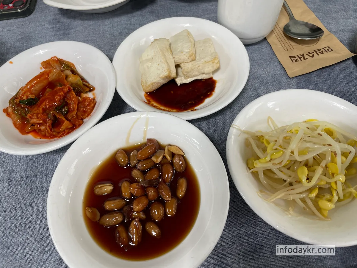일단 기본찬들이 나옵니다. 오픈런 안 하면 웨이팅을 할 수도 있다는 후기를 보고, 오픈시간에 맞춰서 갔어요! 11:30분 오픈인데 저희가 도착한 시간은 11:45분쯤이었습니다. 다행히 기다리지 않고 들어갔어요! 안에 좌석이 생각보다 많은데, 다닥다닥 붙어있어서 좁은 느낌이에요.