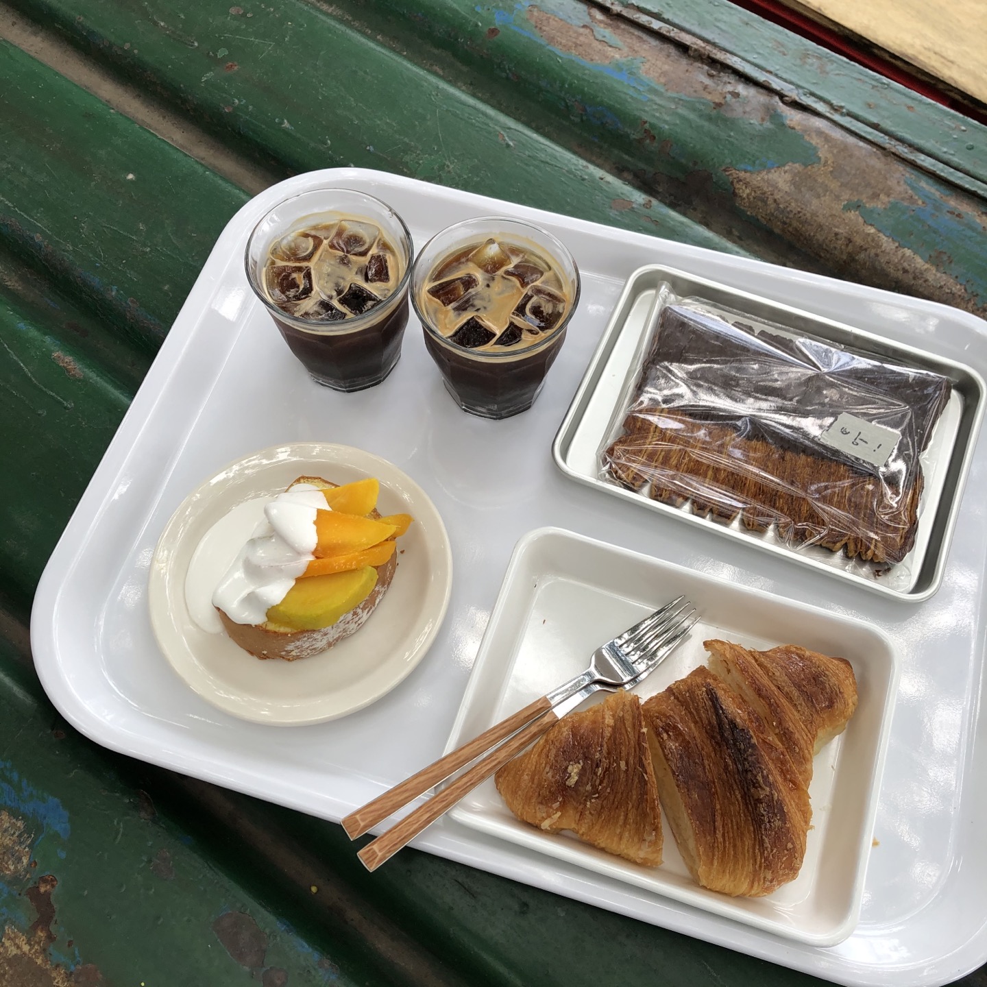 저희가 시킨 메뉴에요, 아메리카노, 빨미까레, 크루와상, 망고롤케이크 입니다. 둘이서 너무 많이 시켰나요..? 그래도 다 너무 맛있어보여서 어쩔 수 없었어요! 빨미까레 위에 빵! 이라고 써있는 게 너무 귀엽지 않나요? 그리고 망고롤케이크는 시즌메뉴인 것 같아요! 풀베개 디저트 종류도 판매하니, 한 번 드셔보는 것도 추천드립니다.