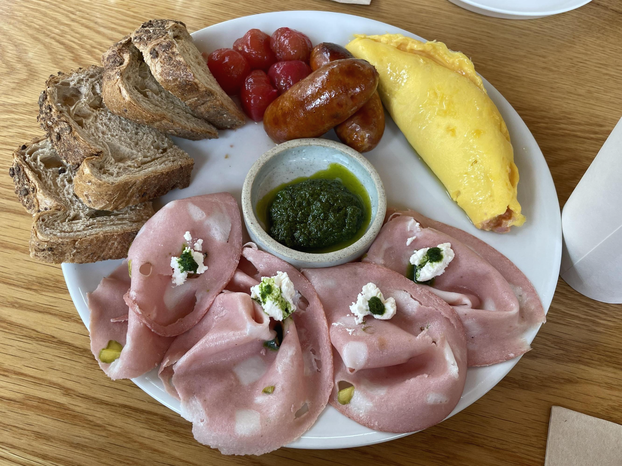 저희가 시킨 메뉴 중 하나, 이잌 브런치입니다. 양이 많아 보이게 플레이팅 해 주신 것 같아요, 맛은 모두가 상상 할 수 있는 그런 맛입니다. 그리고 저기 있는 소세지를 뭣모르고 칼로 자르다가 즙이 터져서 옷에 다 튀겼어요 ㅠㅠ 꼭 드시는 분들 칼로 썰지 마시고 한입에 드세요!! 기름이 튄거라 정말 지우느라 힘들었어요. 흑흑
