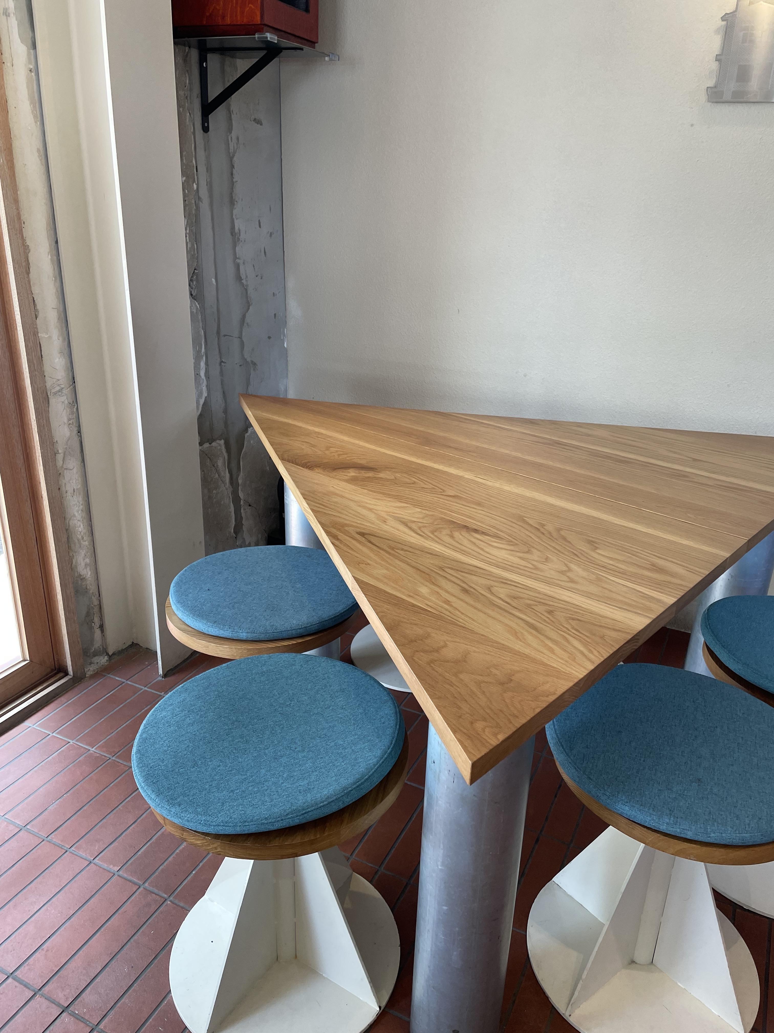 들어가자마자 1층에 있던 테이블이에요, 굉장히 특이하죠! 1층에 세모테이블이 몇개 있는데 1층은 카페손님들을 위한 공간인 것 같아요.