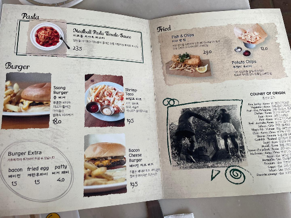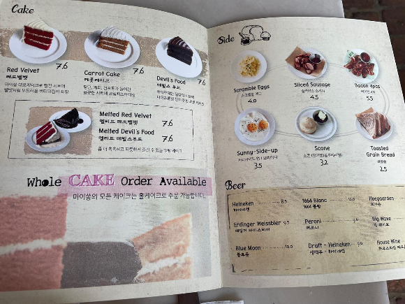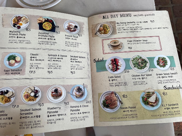 메뉴판 표지부터 예쁜 마이쏭..! 브런치카페이다 보니 브런치메뉴가 다양했고요, 케이크랑 디저트류도 있었어요! 그리고 또 한 가지 팁!! 마이쏭 옆에 파스타 맛집 그랑씨엘이 있는데요. 두 가게를 같은 사장님이 운영하고 계셔서, 마이쏭에서 그랑씨엘 메뉴주문이 가능하답니다. 그랑씨엘이 손님이 많거나 웨이팅이 있다면 마이쏭가서 주문해도 될 것 같아요! 저희는 그래서 그랑씨엘 메뉴판도 달라고 말씀드렸어요!
