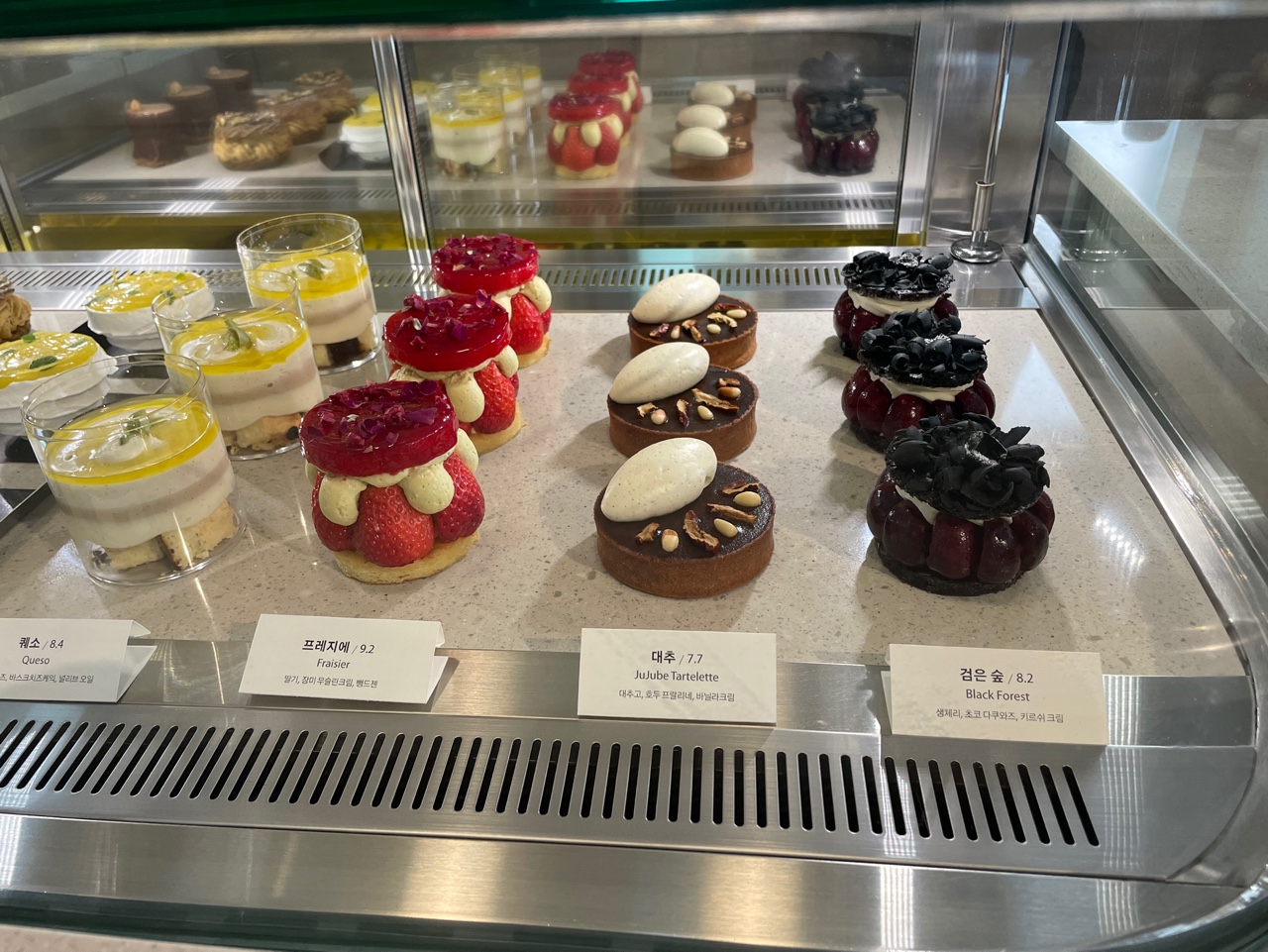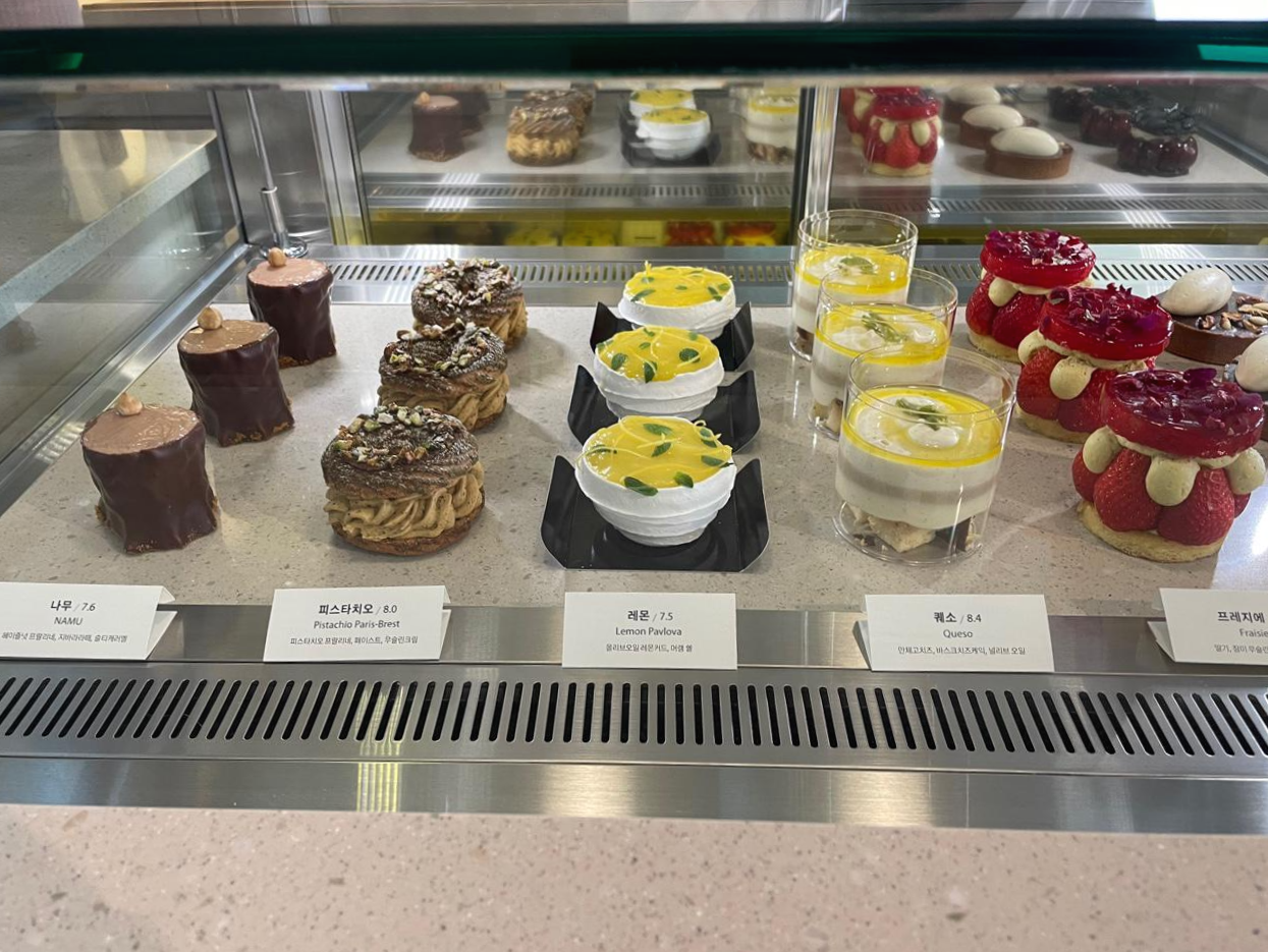 그리고 다른 한 쪽은 쁘띠 케이크(?)류에요! 사실 저는 구움과자류 보다는 케이크류가 목적이였어요!!! 너무 아기자기하게 예뻐서 보는 것만으로도 눈호강이였습니다. 제가 고른 케이크류는 검은숲, 프리지에 였어요.