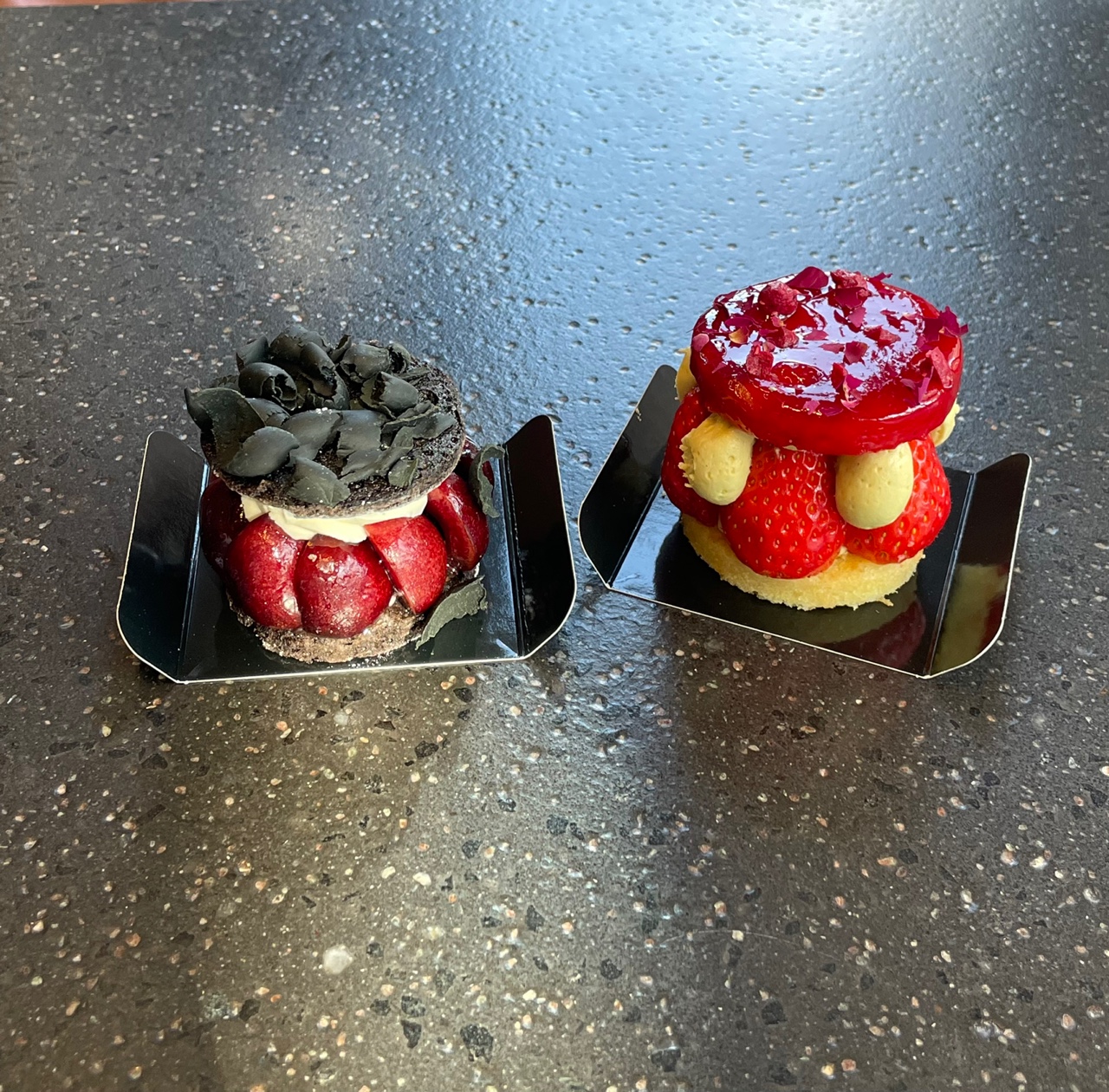 먹기 아까울 정도록 영롱하지 않나요! 남자친구가 고른 왼쪽 검은숲, 오른쪽은 제가 고른 프리지에입니다. 검은숲 맨 위에 검정색은 초코렛이였어요. 그리고 과일은 체리라고 해요. 검은숲은 검은 낙엽들 사이로 붉게 물든 체리를 상상하며 만들었다고 재인 인스타에 소개되어 있어요! 맛표현을 잘 못하겠는데, 정말 매력적인 맛이에요!