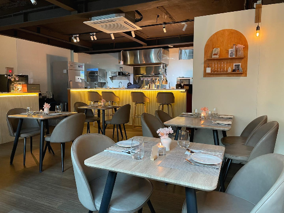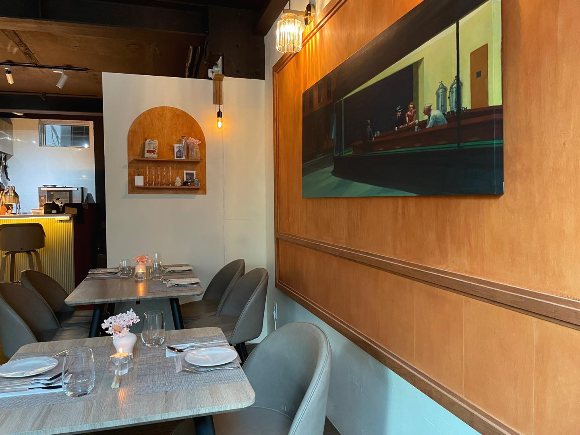 저희는 네이버 예약을 통해 예약하고 방문시간에 맞춰서 도착했어요! 내부는 모던한 분위기에 액자마저도 분위기 있었어요! 매장에는 테이블이 6개 정도 있었던 것 같아요. 요리하시는 곳에도 bar 자리가 있더라고요!