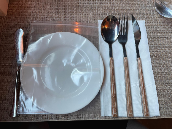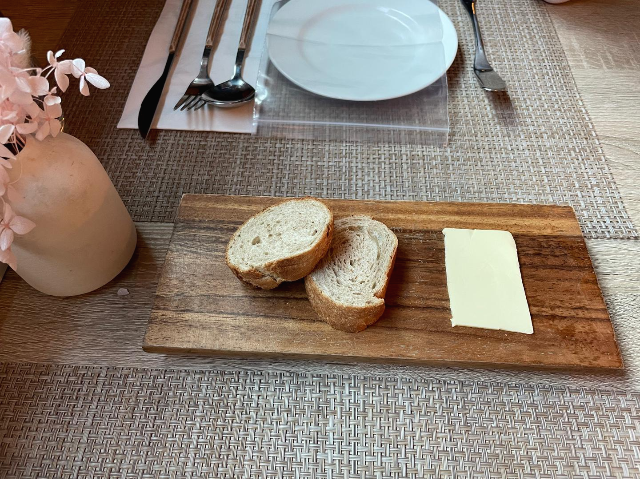 왼쪽 사진은 식전 빵이에요. 호밀빵에 버터와 함께 주셨는데 너무 맛있었어요! 버터가 너무 귀엽게 나왔더라고요! 그리고 오른쪽은 세팅되어있던 건데, 지퍼팩이 있길래 뭐지?! 했는데 마스크를 넣는 용도더라고요. 진짜 손글씨 편지부터, 너무 센스 있지 않나요? 작은 거에 신경을 굉장히 많이 쓰신 게 느껴지더라고요.