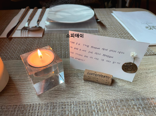 예약좌석으로 안내해주시고, 자리에 앉았더니 손글씨로 직접 쓰신 환영 메시지 카드가 있었어요!! 완전 감동이었어요~ 이런 부분까지 세심하게 준비해주신 우디네 다시 한번 감동입니다!