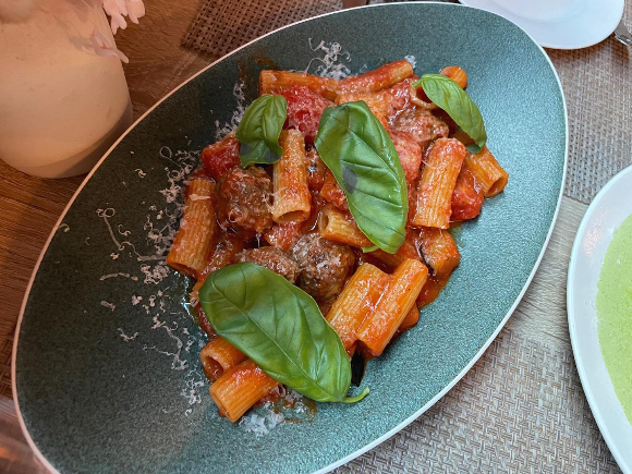 왼쪽) 살치사 포모도로(16,000원) - 살시차 미트볼, 홀토마토소스, 튀긴 가지, 리가토니 건면