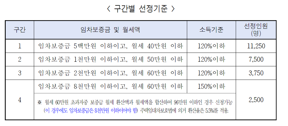 - 선정방법 : 임차보증금, 월세 및 소득 기준 4개 구간으로 나누고 선정인원 초과 시 구간별 전산 무작위 추첨