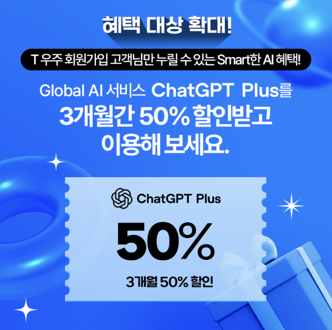 이번에 Chat GPT Plus 반값 행사는 통신사 관계없이 T우주패스 가입자들 모두에게 혜택이 주어진다고 해요!